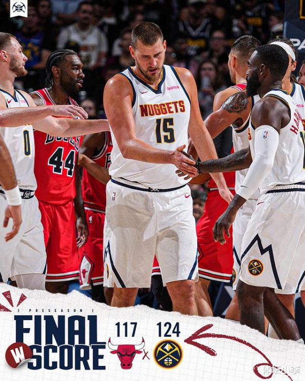 而本场比赛掘金的双子星说明出色,穆雷这边27分钟,18投9中,罚球10中10,拿到全场最高的30分,展现出了我方的得分智商。约基奇这边则还是卓越讲理,出战24分钟,10中7拿到18分8篮板8助攻,着实在季前赛就拿到三双的数据。此外,戈登也有17分,沃特森12分,约翰逊11分。