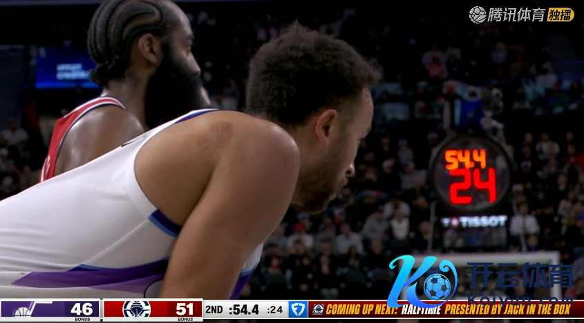 哈登回到场上带队,大洛第8次三分脱手还是打铁,爵士理会打成反击,分差收缩到4分。
