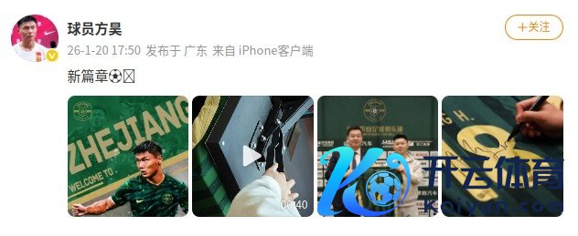 本日方昊更新社媒,晒出我方加盟浙江队的海报以及签约时的像片等,并配文写谈:“新篇章。”