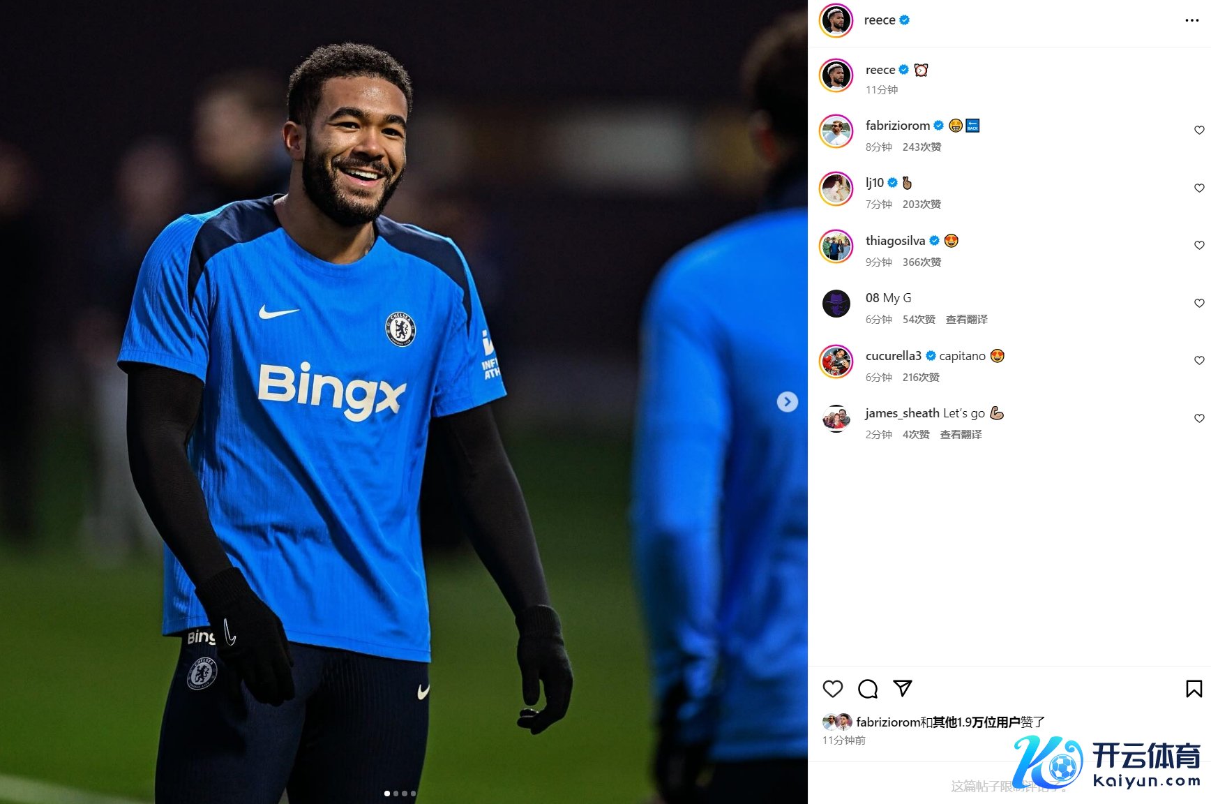 全讯买球网体育信息 12月21日讯切尔西后卫里斯-詹姆斯归附部分合练,看起来行将迎来复出。在酬酢媒体上,英格兰东谈主晒出了我方在进修中沸腾大笑的像片并配上⏰神志,似乎标明我方的复出插足倒计时。 11月下旬,里斯-詹姆斯再次受伤全讯买球网体育信息,这让他缺阵于今。本赛季,由于受到伤病困扰,他仅为切尔西出战了4场比赛。