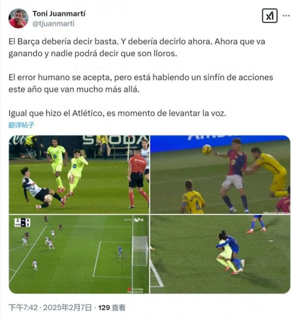 2月7日讯 巴萨跟队记者Toni Juanmartí更新社媒动态,晒出巴萨本赛季遭到误判的视频截图,并默示巴萨应该发声。 “巴萨应该说‘够了’,他们咫尺就应该说出来,咫尺他们正在赢球,莫得东谈主会因此说他们在流泪。东谈主的乖谬是不错采纳的,但本赛季罕有不清的情况远不啻于此。正如马竞所作念的那样,是本事发出咱们的声息了。” 全讯买球网体育信息