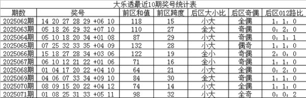 体彩大乐透第25071期开出奖号:0108253133+0511,其中,前区奖号首尾间距为32,和值为98体育集锦,奇偶比为4:1,012路比为1:3:1,大小比为3:2。 一、前区奖号首尾间距分析:最近十期前区奖号开出首尾间距分别为:15、27、29、28、19、16、21、30、14。 1、前区奖号首尾间距大小分析(小于25的首尾间距为小,大于24的首尾间距为大):最近十期首尾间距大小个数比开出5:5,大小首尾间距出现次数疏通,上期首尾间距高潮18点,本期看好首尾间距高潮,在24以上出现。