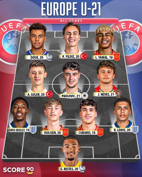 10月13日讯 Score 90评比了欧洲U21年事段的全明星威望,亚马尔、若昂-内维斯领衔,其中西班牙三东谈主,土耳其、法国、英格兰各两东谈主,葡萄牙、德国各一东谈主。 欧洲U21全明星威望: 前卫:杜埃(法国-巴黎)、伊尔迪兹(土耳其-尤文)、亚马尔(西班牙、巴萨) 中场:居莱尔(土耳其-皇马)、帕夫洛维奇(德国-拜仁)、若昂-内维斯(葡萄牙-巴黎) 后卫:斯凯利(英格兰-阿森纳)、赫伊森(西班牙-皇马)、库巴西(西班牙-巴萨)、里科-刘易斯(英格兰-曼城) 门将:雷斯特斯(法国-图卢兹)