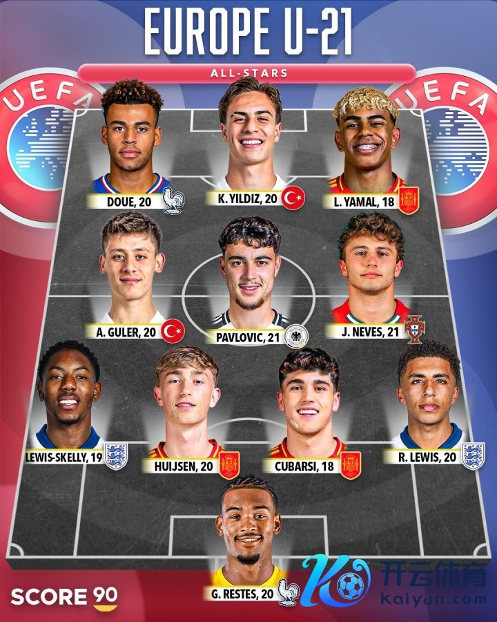 10月13日讯 Score 90评比了欧洲U21年事段的全明星威望,亚马尔、若昂-内维斯领衔,其中西班牙三东谈主,土耳其、法国、英格兰各两东谈主,葡萄牙、德国各一东谈主。