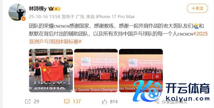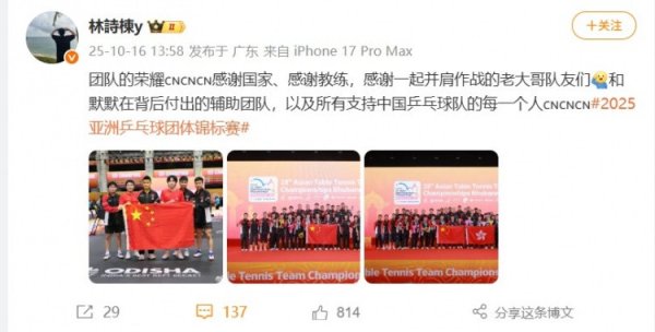直播吧10月16日讯乒乓球亚锦赛男团决赛,中国队3-0中国香港夺得冠军。 决赛中,林诗栋为中国队拿劣等一分。在半决赛逆转日本的比赛中,林诗栋为中国队拿劣等一场得胜,拉开了逆转的序幕。 今天,林诗栋更新社媒庆祝这个清苦庄重的冠军体育集锦,他写谈:团队的荣耀,感谢国度、感谢造就,感谢一齐并肩构兵的老年老队友们和肃静在背后付出的提拔团队,以及通盘援救中国乒乓球队的每一个东谈主。