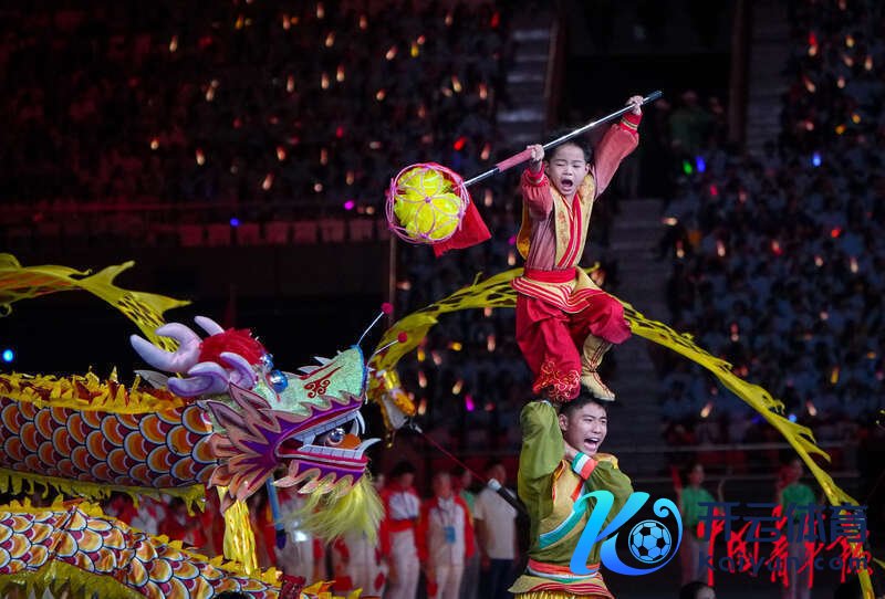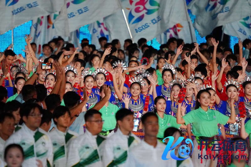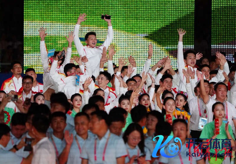 11月22日,海南三亚,第十二届寰宇少数民族传统体育绽放会开幕式上,新疆代表团入场,绽放员跳起来向现场不雅众挥手。中青报·中青网记者 李峥苨/摄