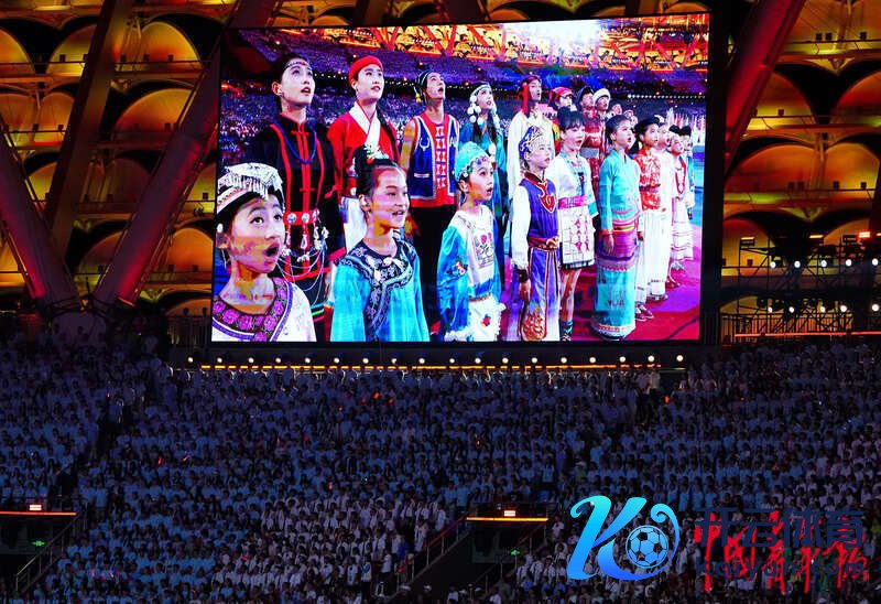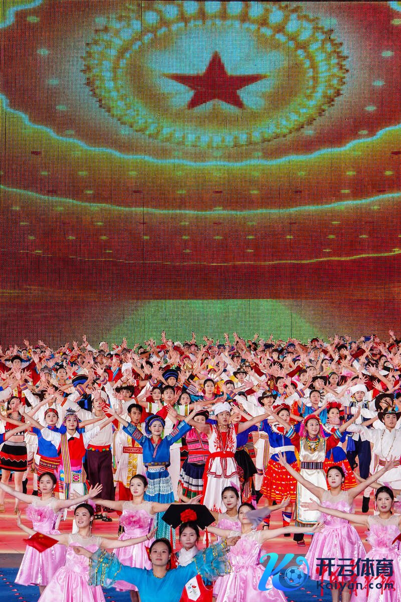 11月22日,海南三亚,第十二届寰宇少数民族传统体育绽放会开幕式,全场都唱国歌。中青报·中青网记者 李峥苨/摄