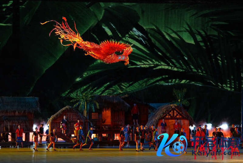 11月22日,海南三亚,第十二届寰宇少数民族传统体育绽放会开幕式文艺上演,“甘工鸟”衔来稻穗,在海南特质民居前,演员展现海南各族东说念主民忙绿劳顿的场景。中青报·中青网记者 李峥苨/摄
