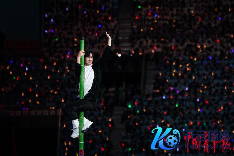 11月22日,海南三亚,第十二届寰宇少数民族传统体育绽放会开幕式上,四川代表团入场时,装璜成熊猫的扮演者爬上竹竿向不雅众挥手致敬。各代表团进行了30秒的驻停扮演,展示民族文化与所在特质。中青报·中青网记者 李峥苨/摄
