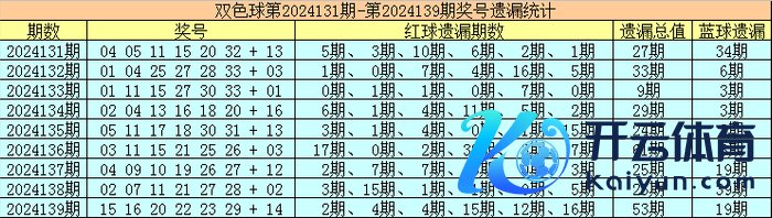 双色球第2024139期开奖号码为:15 16 20 22 23 29 + 14,其中红球遗漏期数分手为:2期、4期、4期、15期、12期、16期,遗漏总期数为53期体育集锦,蓝球遗漏19期。