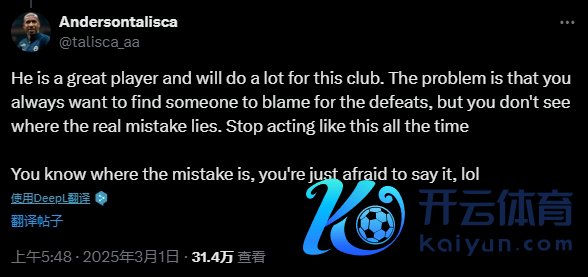 该球迷在社媒上发表杜兰本场比赛的数据,并发问何如评价他这场比赛的发扬。塔利斯卡在该条动态下回应:他是又名伟大的球员,将为俱乐部作念出庞杂孝顺。问题是,你们老是念念把失败归罪于某个东说念主,却看不见确实的罅隙在那儿,别老是这么。你们知说念问题在那儿,仅仅不敢说辛劳,笑死我了。