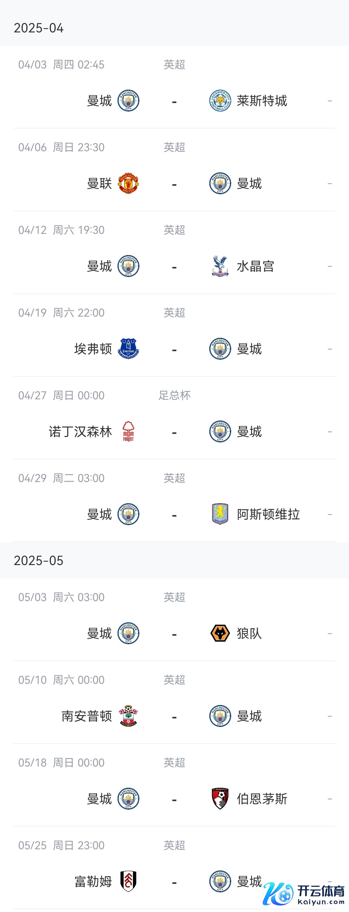 曼城本赛季剩余赛程↓