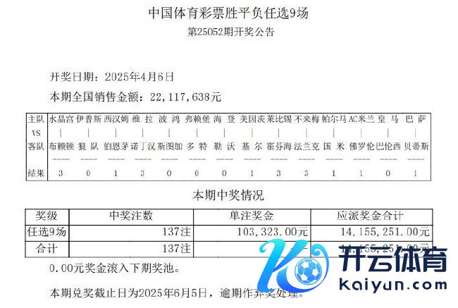 北京本事4月6日体育集锦,足彩第25052期任九开奖效果揭晓。本期任九开出137注10.3万元。任九投注总数为22,117,638元。