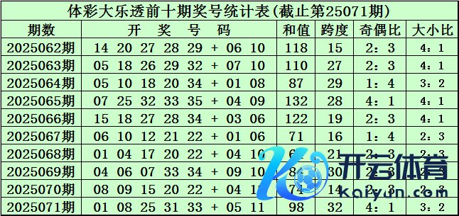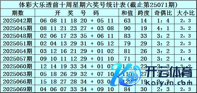 体彩大乐透上周星期六开出奖号为:04 06 07 33 34 + 09 10。前区奖号和值为84,跨度为30,奇偶比为2:3,大小比为2:3。后区奖号和值为19体育录像/图片,跨度为1。
