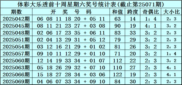 体彩大乐透上周星期六开出奖号为:0406073334+0910。前区奖号和值为84,跨度为30,奇偶比为2:3,大小比为2:3。后区奖号和值为19体育录像/图片,跨度为1。 体彩大乐透第25071期奖号为:0108253133+0511。前区奖号和值为98,跨度为32,奇偶比为4:1,大小比为3:2。后区奖号和值为16,跨度为6。 前区奇偶号码:最近十周星期六前区奇偶奖号个数比为25:25,奇偶号码出号基本均衡,最近10期前区号码奇偶个数比为22:28,偶数号码显着较热,上期奖号奇偶比为4:1