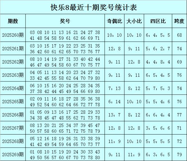 福彩欣慰8第2025269期开奖总结:0108101519202430334349505657606770737880,其中奖号奇偶比开出9:11,大小比开出11:9,包含4个小奇号码:01151933,5个小偶号码:0810202430,5个大奇号码:4349576773,6个大偶号码:505660707880。 欣慰8第2025270期奖号奇偶、大小分析 小奇号码分析:上期奖号包含4个小奇号码:01151933,走势与表面差未几,最近5期小奇号码开出26个,出现个数在表面值隔邻波动,最近1