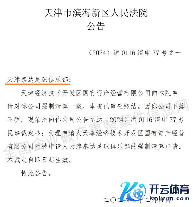 天津市滨海新区东谈主民法院(以下简称“天津滨海新区法院”)在12月4日开庭审理了天津经济时间开辟区国有钞票标的有限公司(以下简称“天津经开区国资公司”)肯求对天津泰达足球俱乐部的强制清理一案,案件已审查拆伙。