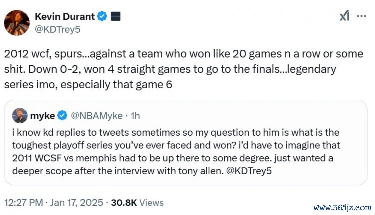 1月17日讯 今天,太阳球星杜兰特在网上和网友互动。 谈到我方濒临过最难懂的季后赛系列赛,杜兰特复兴谈:“2012年西部决赛,濒临马刺,他们那时大概20连胜了(在濒临雷霆之前、马刺老例赛+季后赛18连胜)。咱们系列赛0-2过期开局,然后4连胜干涉总决赛。在我看来那是一个传闻的系列赛,尤其是G6。” 在G6中,雷霆以107-99打败马刺,杜兰特打满48分钟,17中9,三分8中4,罚球15中12体育录像/图片,取得34分14篮板5助攻1抢断2盖帽。