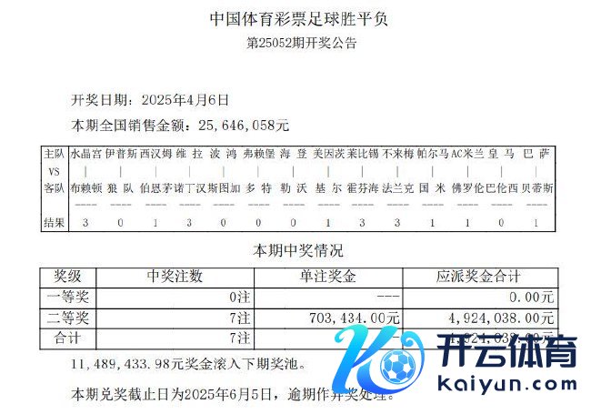 北京技巧4月6日,足彩第25052期开奖恶果揭晓。本期头奖空开,二等奖开出7注70.3万,11,489,433.98元奖金滚入下期,任九开出137注10.3万元。本期足彩销量为25,646,058元,任九投注总数为22,117,638元。
