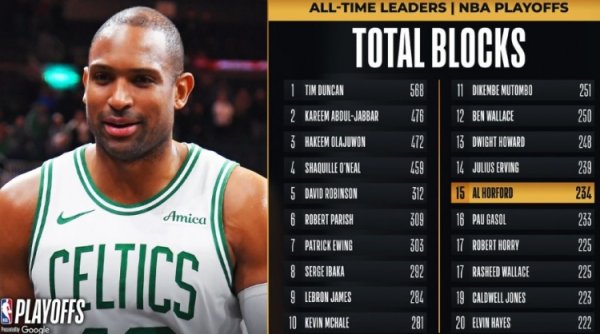 当今,霍福德一经送出了3记盖帽,他的季后赛盖帽总额来到234记,超过保罗-加索尔体育赛事直播,飞腾至NBA历史第15位。
