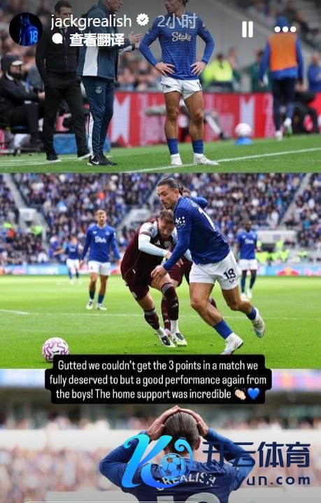 直播吧9月14日讯 在埃弗顿0-0战平维拉后体育赛事直播,埃弗顿球员格拉利什更新了酬酢媒体。 格拉利什写说念:“很缺憾咱们没能拿下咱们足够应得的三分,但球员们的发扬还是出色!主场球迷的撑合手相当棒 ”