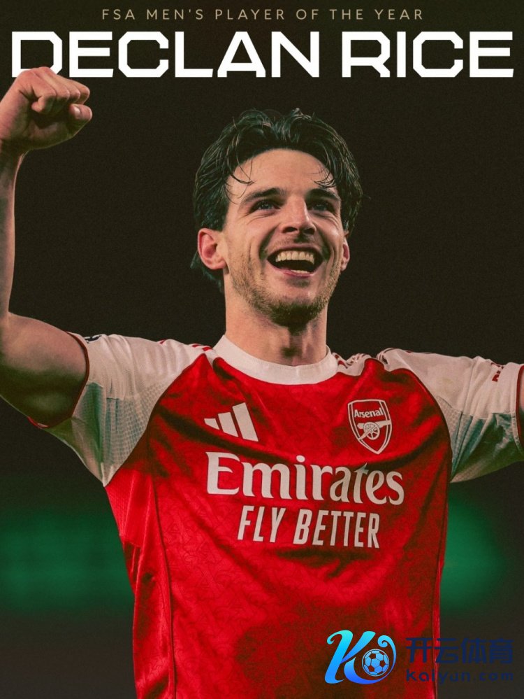 赖斯获颁英格兰和威尔士球迷组织FSA年度最好男足球员奖,阿森纳官方社媒晒出海报体育赛事直播,配文:“流程全英国球迷的投票,赖斯当选FSA年度最好男足球员,实至名归。”