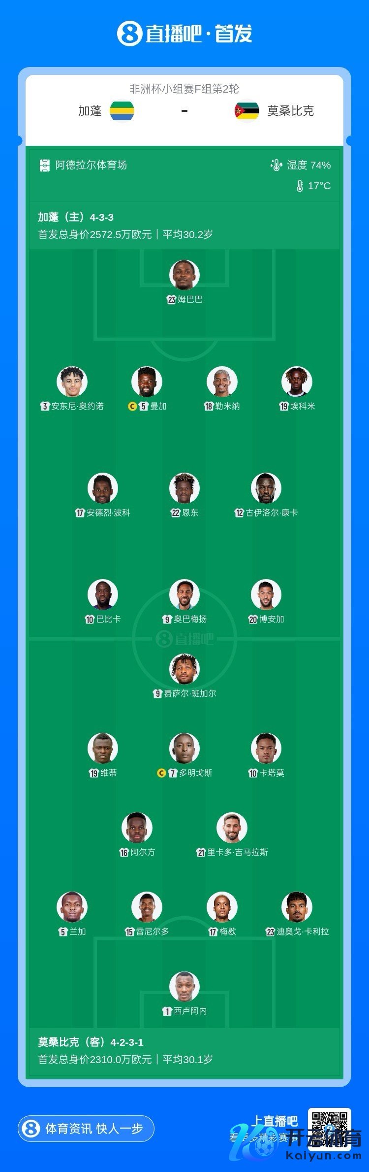 加蓬首发:23-洛伊斯·姆巴巴、3-安东尼·奥约诺、5-布鲁诺·曼加、9-奥巴梅扬、10-巴比卡、12-古洛伊尔·康卡、17-安德烈·波科、18-勒米纳、19-埃科米、20-博安加、22-迪迪埃·恩东