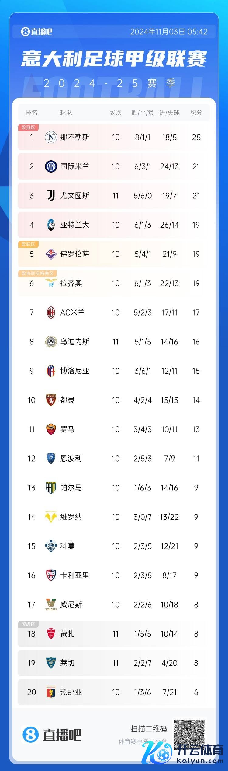 意甲积分榜:米兰赢球暂升联赛第七 那不勒斯4分上风领跑