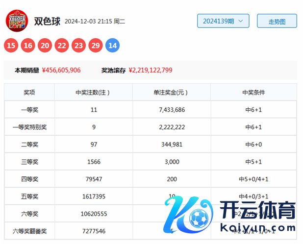 双色球第2024139期奖号为:15、16、20、22、23、29+14。