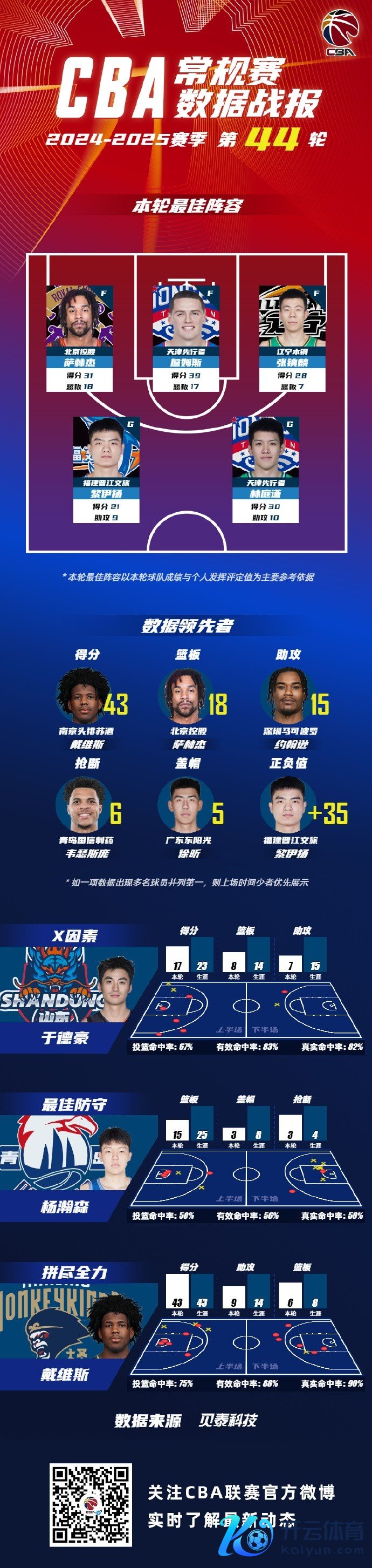 数据卓绝者方面:南京同曦篮球俱乐部球员戴维斯以单场43分的数据领衔得分榜;